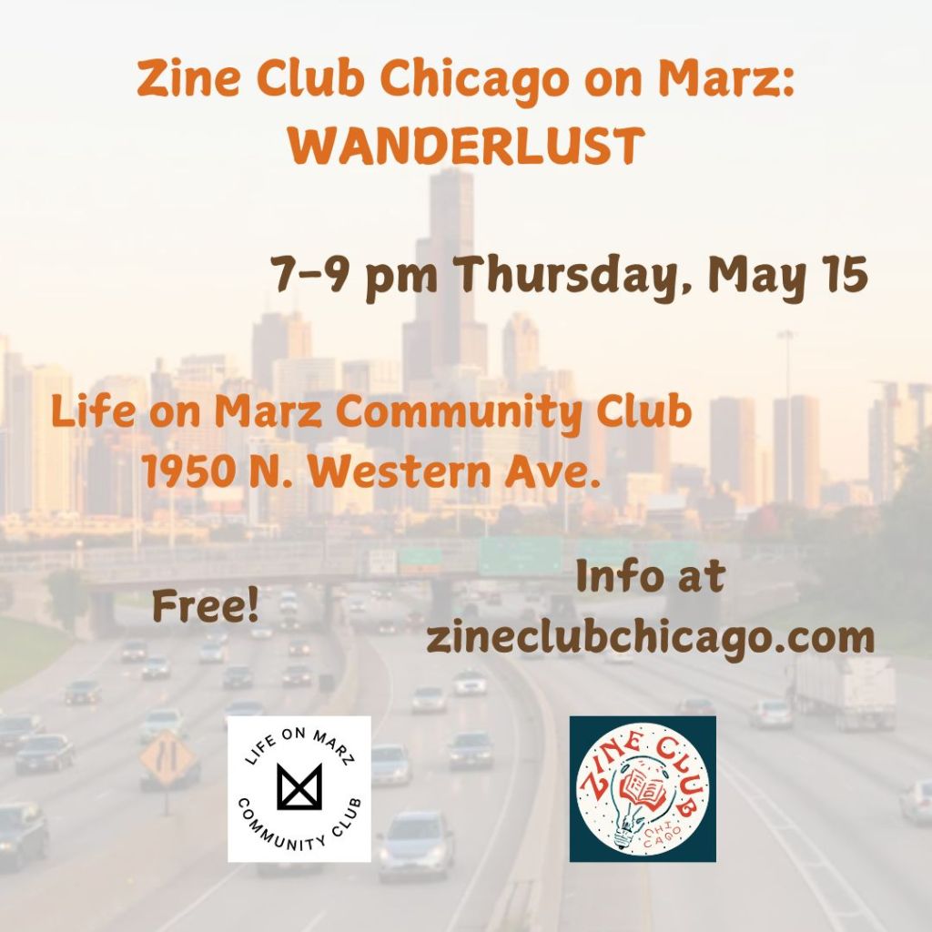 Image description: A flyer featuring an image of a multi-lane highway with the Chicago skyline in the background and this text: “Zine Club Chicago on Marz: Wanderlust; 7-9 p.m. Thursday, May 15; Life on Marz Community Club, 1950 N. Western Ave; Free!; Info at zineclubchicago.com”