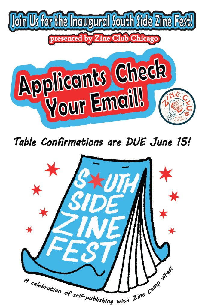 Image description: A blue and red flyer featuring the South Side Zine Fest and Zine Club Chicago logos and this text: “Join Us for the Inaugural South Side Zine Fest! Presented by Zine Club Chicago; A celebration of self-publishing with Zine Camp vibes!; Applicants Check Your Email!; Table confirmations are DUE June 15!”