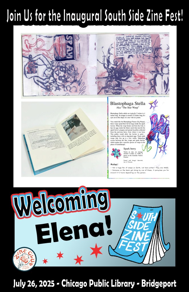 Image description: A collage of several images of zines created by South Side Zine Fest 2025 exhibitor Elena and this text: “Join us for the inaugural South Side Zine Fest! Welcoming Elena!; July 26, 2025; Chicago Public Library; Bridgeport”
