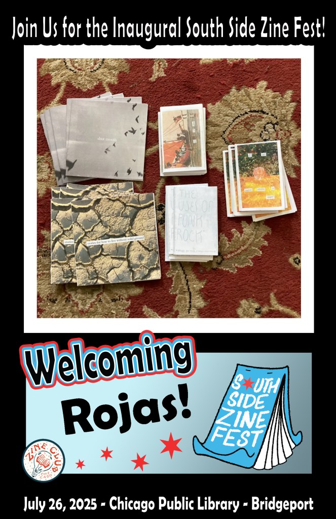 Image description: A collage of several images of zines created by the South Side Zine Fest 2025 exhibitor Rojas and this text: “Join us for the inaugural South Side Zine Fest! Welcoming Rojas!; July 26, 2025; Chicago Public Library; Bridgeport”