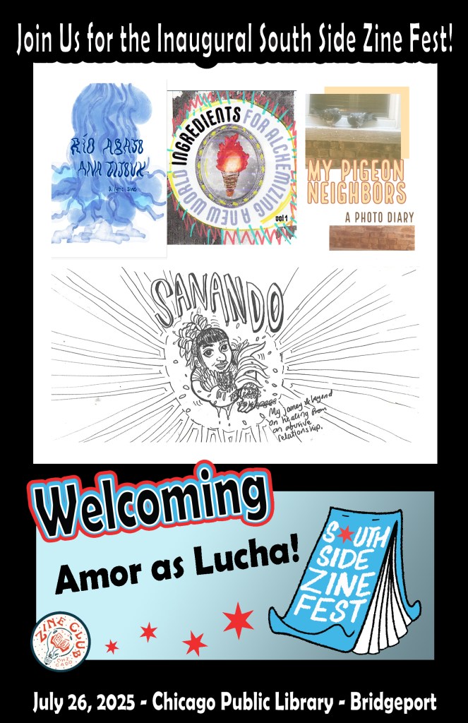 Image description: A collage of several images of zines created by the South Side Zine Fest 2025 exhibitor Amor as Lucha and this text: “Join us for the inaugural South Side Zine Fest! Welcoming Amor as Lucha!; July 26, 2025; Chicago Public Library; Bridgeport”