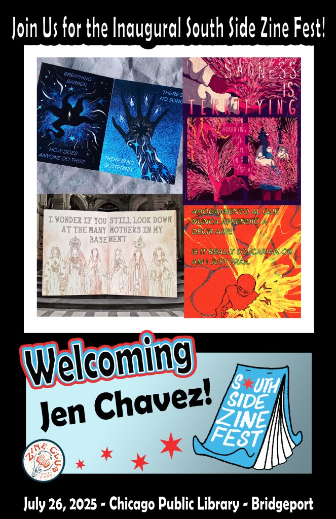 Image description: A collage of images of zines created by South Side Zine Fest 2025 exhibitor Jen Chavez, with this text: “Join us for the inaugural South Side Zine Fest! Welcoming Jen Chavez!; July 26, 2025; Chicago Public Library; Bridgeport”