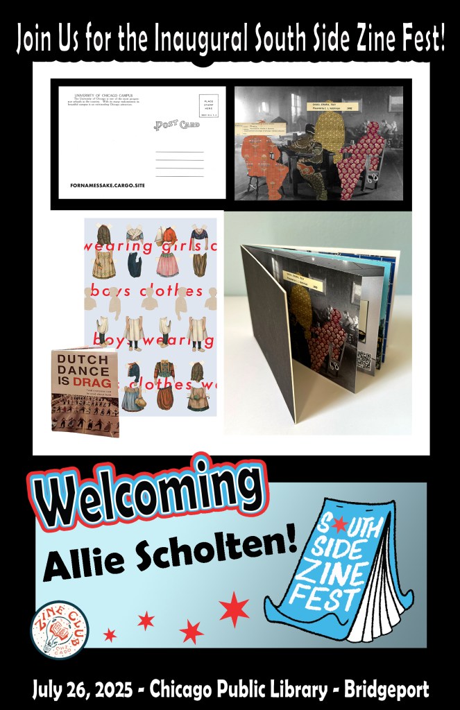 Image description: A collage of images of zines created by South Side Zine Fest 2025 exhibitor Allie Scholten, with this text: “Join us for the inaugural South Side Zine Fest! Welcoming Allie Scholten!; July 26, 2025; Chicago Public Library; Bridgeport”