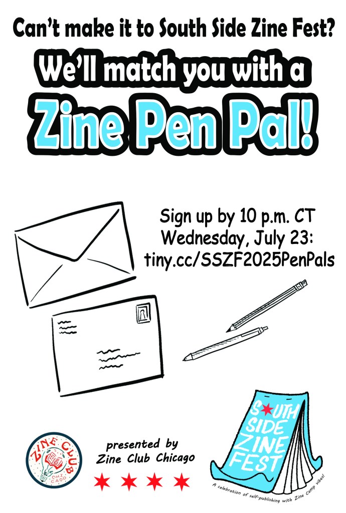 Image description: A flyer featuring illustrations of envelopes and writing implements, the South Side Zine Fest logo, and this text: “Can’t make it to South Side Zine Fest? We’ll match you with a zine pen pal! Sign up by 10 p.m. CT Wednesday, July 23: tiny.cc/SSZF2025PenPals