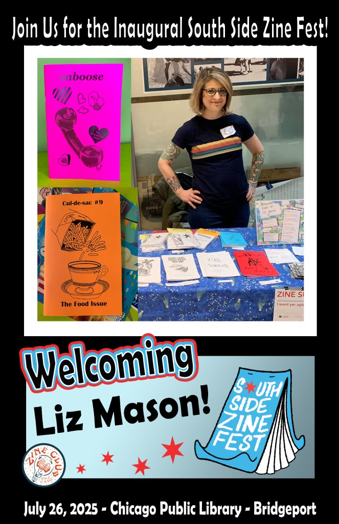 Image description: A collage of images of South Side Zine Fest 2025 exhibitor Liz Mason and her zines with this text: “Join us for the inaugural South Side Zine Fest! Welcoming Liz Mason!; July 26, 2025; Chicago Public Library; Bridgeport”