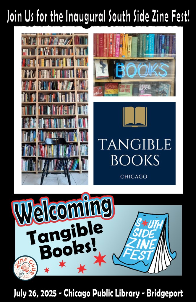 Image description: A collage of photos of South Side Zine Fest 2025 community partner Tangible Books this text: “Join us for the inaugural South Side Zine Fest! Welcoming Tangible Books!; July 26, 2025; Chicago Public Library; Bridgeport”