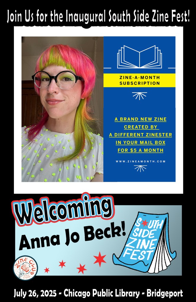 Zine newbies and longtime enthusiasts alike are always welcome at Zine Club Chicago. This free community event series is produced by Cynthia E. Hanifin. Anna Jo Beck is the creative force behind our visuals. Liz Mason is our indispensable co-conspirator.