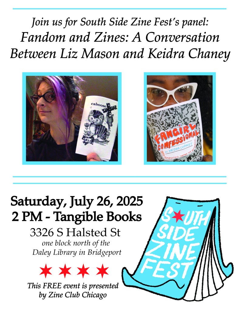 Image description: A flyer featuring photos of zinemakers Liz Mason and Keidra Chaney, the South Side Zine Fest logo, and this text: “Join us for South Side Zine Fest’s pane: Fandom and Zines: A Conversation with Liz Mason and Keidra Chaney; Saturday, July 26, 2025; 2 p.m.-Tangible Books, 3326 S. Halsted St., one block north of the Daley Library in Bridgeport; This FREE event is sponsored by Zine Club Chicago”